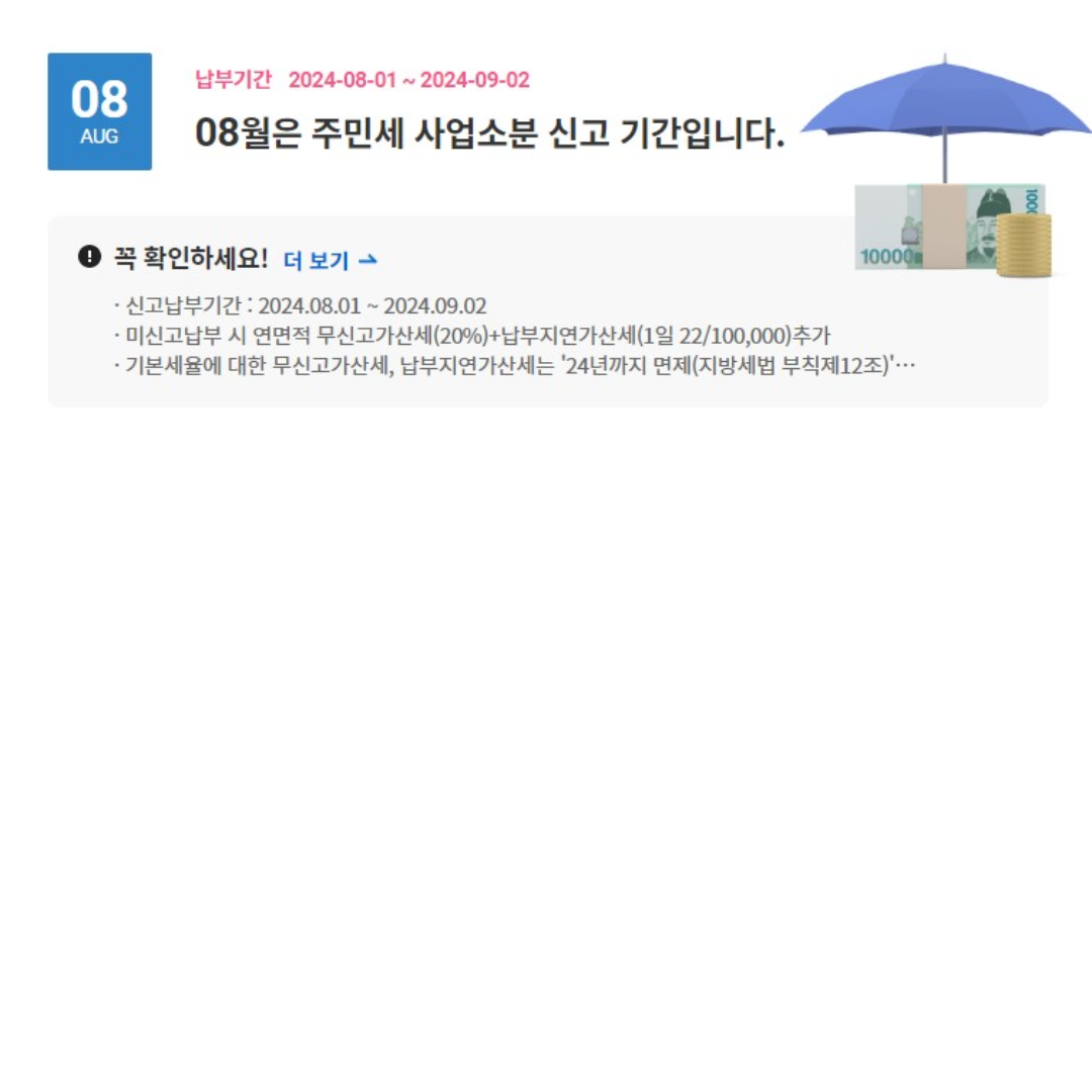 주민세 사업소분 신고기간입니다. 주민세 사업소분 신고 납부기간 및 신고 납부하는 방법을 알려드립니다. 주민세 사업소분 신고 납부 바로가기하셔서 신고 납부 하셔서 가산세 내는 일이 없으시길 바랍니다. 주민세 사업소분 신고 납부 미리계산해보실 수도 있습니다. 미리계산해보시기 신고 납부 하시기 바랍니다. 주민세(사업소분) 신고 납부하기 주민세(사업소분) 미리계산하기 주민세(사업소분) 납부내역 확인하기